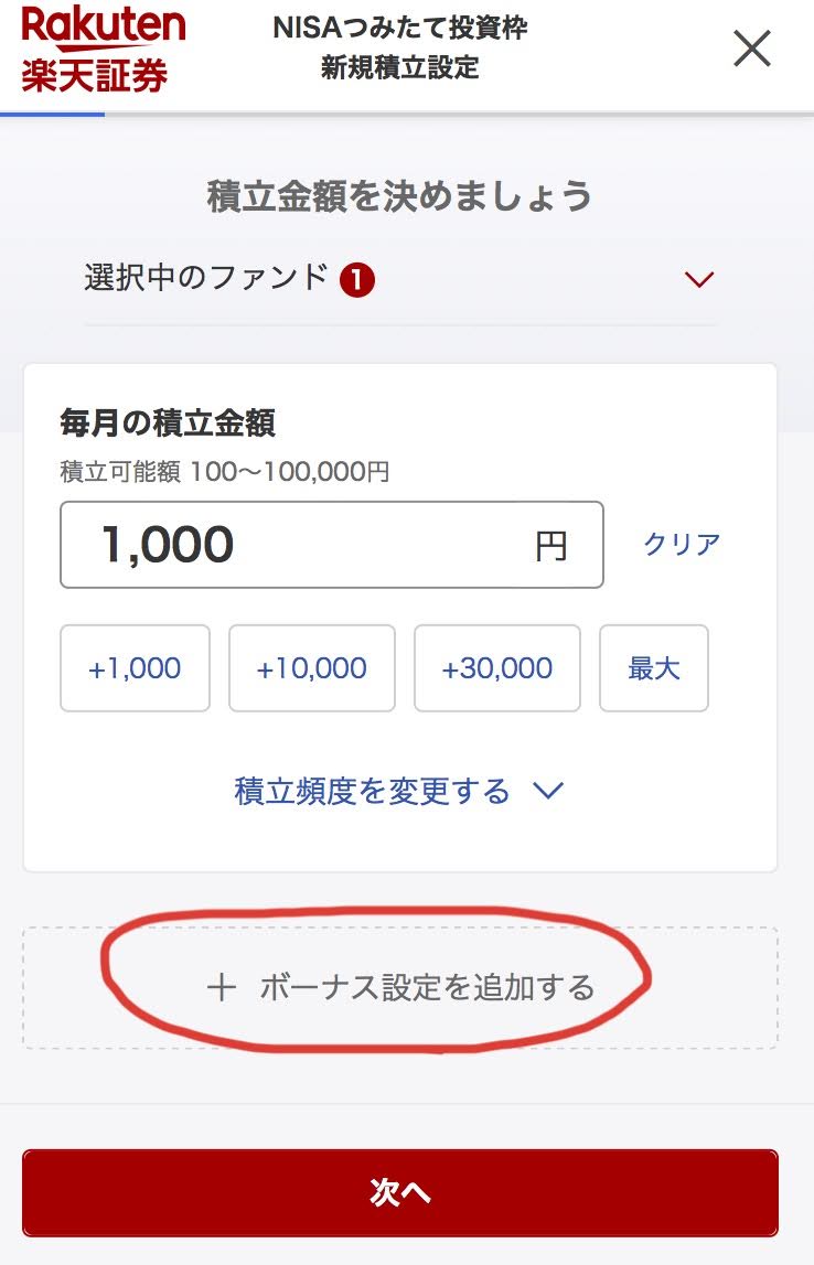 ボーナス時に積立額を増やせる方は、ボーナス設定を追加するをクリックし、ボーナス時に追加できる金額を入れてください。